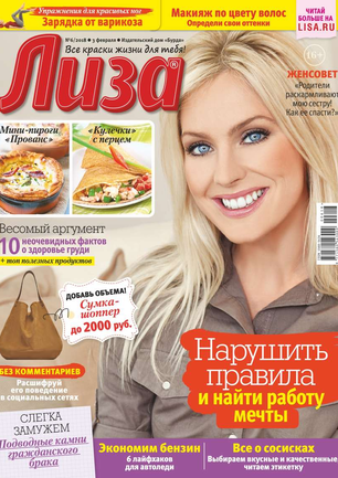 Самый популярный в России еженедельный журнал для молодых женщин «Лиза» стал еще интереснее, еще привлекательнее для читательниц. Теперь больше знаменитостей на страницах любимого журнала! Фитнес со звездой и звездный макияж, уроки стиля и самые горячие новости из жизни кумиров. А еще — модный шопинг, актуальная мода, новинки косметики и великолепные идеи для дома. Романтические истории о настоящей любви и рассказы читательниц о разных жизненных ситуациях. Аспекты психологии, секреты успешных отношений с окружающими и искусство сохранения любви.