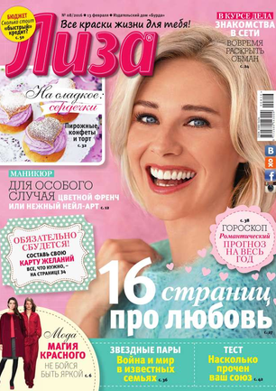 Самый популярный в России еженедельный журнал для молодых женщин «Лиза» стал еще интереснее, еще привлекательнее для читательниц. Теперь больше знаменитостей на страницах любимого журнала! Фитнес со звездой и звездный макияж, уроки стиля и самые горячие новости из жизни кумиров. А еще — модный шопинг, актуальная мода, новинки косметики и великолепные идеи для дома. Романтические истории о настоящей любви и рассказы читательниц о разных жизненных ситуациях. Аспекты психологии, секреты успешных отношений с окружающими и искусство сохранения любви.