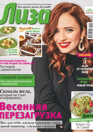 Самый популярный в России еженедельный журнал для молодых женщин «Лиза» стал еще интереснее, еще привлекательнее для читательниц. Теперь больше знаменитостей на страницах любимого журнала! Фитнес со звездой и звездный макияж, уроки стиля и самые горячие новости из жизни кумиров. А еще — модный шопинг, актуальная мода, новинки косметики и великолепные идеи для дома. Романтические истории о настоящей любви и рассказы читательниц о разных жизненных ситуациях. Аспекты психологии, секреты успешных отношений с окружающими и искусство сохранения любви.