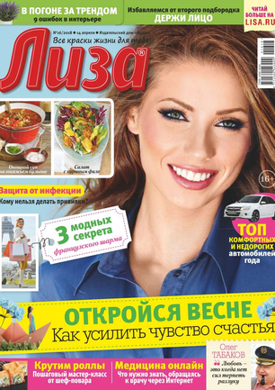 Самый популярный в России еженедельный журнал для молодых женщин «Лиза» стал еще интереснее, еще привлекательнее для читательниц. Теперь больше знаменитостей на страницах любимого журнала! Фитнес со звездой и звездный макияж, уроки стиля и самые горячие новости из жизни кумиров. А еще — модный шопинг, актуальная мода, новинки косметики и великолепные идеи для дома. Романтические истории о настоящей любви и рассказы читательниц о разных жизненных ситуациях. Аспекты психологии, секреты успешных отношений с окружающими и искусство сохранения любви.