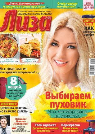 Самый популярный в России еженедельный журнал для молодых женщин «Лиза» стал еще интереснее, еще привлекательнее для читательниц. Теперь больше знаменитостей на страницах любимого журнала! Фитнес со звездой и звездный макияж, уроки стиля и самые горячие новости из жизни кумиров. А еще — модный шопинг, актуальная мода, новинки косметики и великолепные идеи для дома. Романтические истории о настоящей любви и рассказы читательниц о разных жизненных ситуациях. Аспекты психологии, секреты успешных отношений с окружающими и искусство сохранения любви.