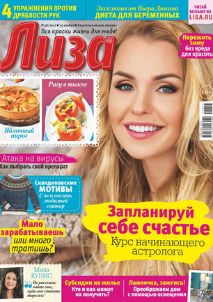 Самый популярный в России еженедельный журнал для молодых женщин «Лиза» стал еще интереснее, еще привлекательнее для читательниц. Теперь больше знаменитостей на страницах любимого журнала! Фитнес со звездой и звездный макияж, уроки стиля и самые горячие новости из жизни кумиров. А еще — модный шопинг, актуальная мода, новинки косметики и великолепные идеи для дома. Романтические истории о настоящей любви и рассказы читательниц о разных жизненных ситуациях. Аспекты психологии, секреты успешных отношений с окружающими и искусство сохранения любви.