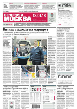 «Вечерняя Москва» — ежедневная российская вечерняя газета, старейшее из вечерних изданий в России, учрежденное в 1923 году. Выходит пять дней в неделю, кроме субботы и воскресенья. Отличается тем, что рассказывает о событиях еще не завершившегося дня. Оперативно освещает хронику и особенности жизни Москвы, охватывает все слои общества и большинство профессиональных и возрастных групп читателей.Издание представлено тремя выпусками – утренним ежедневным, вечерним (выходит три раза в неделю), еженедельным (выходит по четвергам).