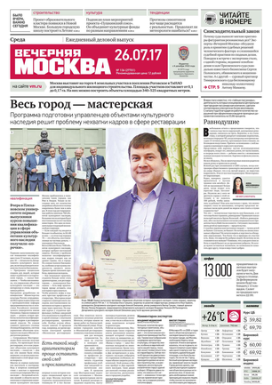 «Вечерняя Москва» — ежедневная российская вечерняя газета, старейшее из вечерних изданий в России, учрежденное в 1923 году. Выходит пять дней в неделю, кроме субботы и воскресенья. Отличается тем, что рассказывает о событиях еще не завершившегося дня. Оперативно освещает хронику и особенности жизни Москвы, охватывает все слои общества и большинство профессиональных и возрастных групп читателей.Издание представлено тремя выпусками – утренним ежедневным, вечерним (выходит три раза в неделю), еженедельным (выходит по четвергам).