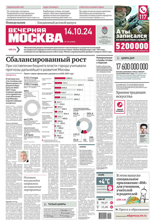«Вечерняя Москва» — ежедневная российская вечерняя газета, старейшее из вечерних изданий в России, учрежденное в 1923 году. Выходит пять дней в неделю, кроме субботы и воскресенья. Отличается тем, что рассказывает о событиях еще не завершившегося дня. Оперативно освещает хронику и особенности жизни Москвы, охватывает все слои общества и большинство профессиональных и возрастных групп читателей.Издание представлено тремя выпусками – утренним ежедневным, вечерним (выходит три раза в неделю), еженедельным (выходит по четвергам).