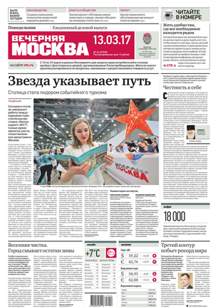 «Вечерняя Москва» — ежедневная российская вечерняя газета, старейшее из вечерних изданий в России, учрежденное в 1923 году. Выходит пять дней в неделю, кроме субботы и воскресенья. Отличается тем, что рассказывает о событиях еще не завершившегося дня. Оперативно освещает хронику и особенности жизни Москвы, охватывает все слои общества и большинство профессиональных и возрастных групп читателей.Издание представлено тремя выпусками – утренним ежедневным, вечерним (выходит три раза в неделю), еженедельным (выходит по четвергам).