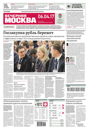 «Вечерняя Москва» — ежедневная российская вечерняя газета, старейшее из вечерних изданий в России, учрежденное в 1923 году. Выходит пять дней в неделю, кроме субботы и воскресенья. Отличается тем, что рассказывает о событиях еще не завершившегося дня. Оперативно освещает хронику и особенности жизни Москвы, охватывает все слои общества и большинство профессиональных и возрастных групп читателей.Издание представлено тремя выпусками – утренним ежедневным, вечерним (выходит три раза в неделю), еженедельным (выходит по четвергам).