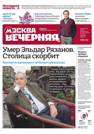 «Вечерняя Москва» — ежедневная российская вечерняя газета, старейшее из вечерних изданий в России, учрежденное в 1923 году. Выходит пять дней в неделю, кроме субботы и воскресенья. Отличается тем, что рассказывает о событиях еще не завершившегося дня. Оперативно освещает хронику и особенности жизни Москвы, охватывает все слои общества и большинство профессиональных и возрастных групп читателей.Издание представлено тремя выпусками – утренним ежедневным, вечерним (выходит три раза в неделю), еженедельным (выходит по четвергам).