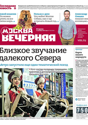 «Вечерняя Москва» — ежедневная российская вечерняя газета, старейшее из вечерних изданий в России, учрежденное в 1923 году. Выходит пять дней в неделю, кроме субботы и воскресенья. Отличается тем, что рассказывает о событиях еще не завершившегося дня. Оперативно освещает хронику и особенности жизни Москвы, охватывает все слои общества и большинство профессиональных и возрастных групп читателей.Издание представлено тремя выпусками – утренним ежедневным, вечерним (выходит три раза в неделю), еженедельным (выходит по четвергам).