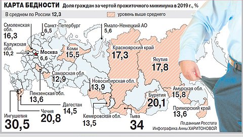 Доля людей, которым не хватает на жизнь, отличается в разных регионах России в 6 раз.