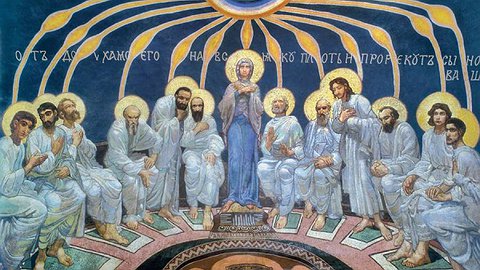 Богородица и апостолы собрались в Сионской горнице, чтобы отметить праздник, когда евреи вспоминают о дарованных Богом Моисею на горе Синай Десяти заповедях (как раз на 50-й день после Исхода из Египта). А заодно радуются первому урожаю, украшая дома плодами и колосьями пшеницы (отсюда зеленое убранство и наших храмов на Троицу). «Внезапно, — сказано в „Деяниях апостолов“, — сделался шум с неба, как бы от несущегося сильного ветра, и наполнил весь дом. И явились им разделяющиеся языки, как бы огненные, и почили по одному на каждом из них. И исполнились все Духа Святаго, и начали говорить на иных языках, как Дух давал им провещевать».