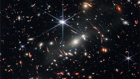 Главным объектом снимка стало скопление галактик SMACS 0723 (ярко-белая эллиптическая галактика в центре и маленькие белые галактики по всему полю), в том виде, в каком оно появилось 4,6 миллиарда лет назад. Огромная масса скопления действует как гравитационная линза, увеличивая и искажая более далёкие галактики, в том числе те, которые возникли, когда Вселенной было меньше миллиарда лет. Это самые чёткие и подробные изображения звёздных скоплений в ранней Вселенной. Гравитационное линзирование проявляется, в частности, в создании зеркальных изображений отдельных галактик, яркими примерами которых служат оранжевые дуги слева и справа от центральной галактики скопления. Каждая зеркальная галактика отобразилась дважды на одной дуге. На изображении видны их яркие ядра, заполненные звёздами, и звёздные скопления по краям...